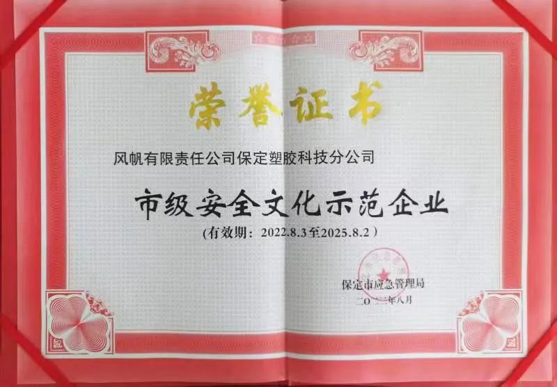 近日,保定市應(yīng)急管理局發(fā)布了2021年度市級(jí)安全文化建設(shè)示范企業(yè)名單,風(fēng)帆塑膠科技分公司獲評(píng)“市級(jí)安全文化建設(shè)示范企業(yè)”。