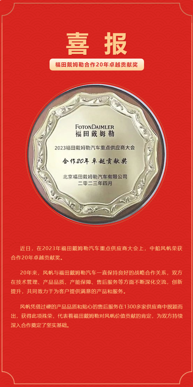 中船風(fēng)帆榮獲福田戴姆勒合作20年卓越貢獻(xiàn)獎