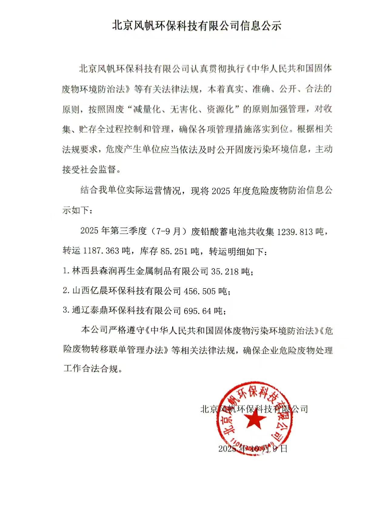 北京風(fēng)帆環(huán)??萍加邢薰?025年第三季度危險(xiǎn)廢物信息公示